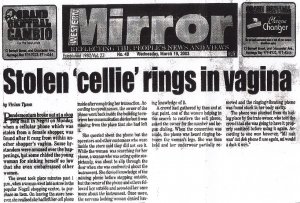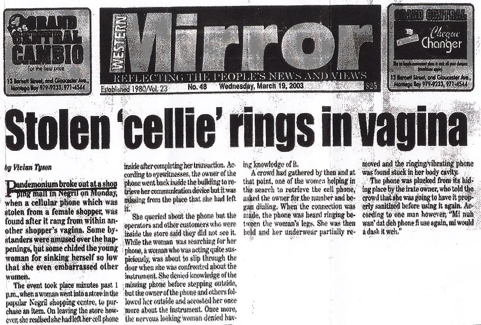 Pandemonium broke out at a shopping mall in Negril on Monday, when a cellular phone which was stolen from a female shopper was found after it rang from within another shopper’s vagina. Some bystanders were amused over the happenings, but some chided the young woman for sinking so low that she even embarrassed other women.